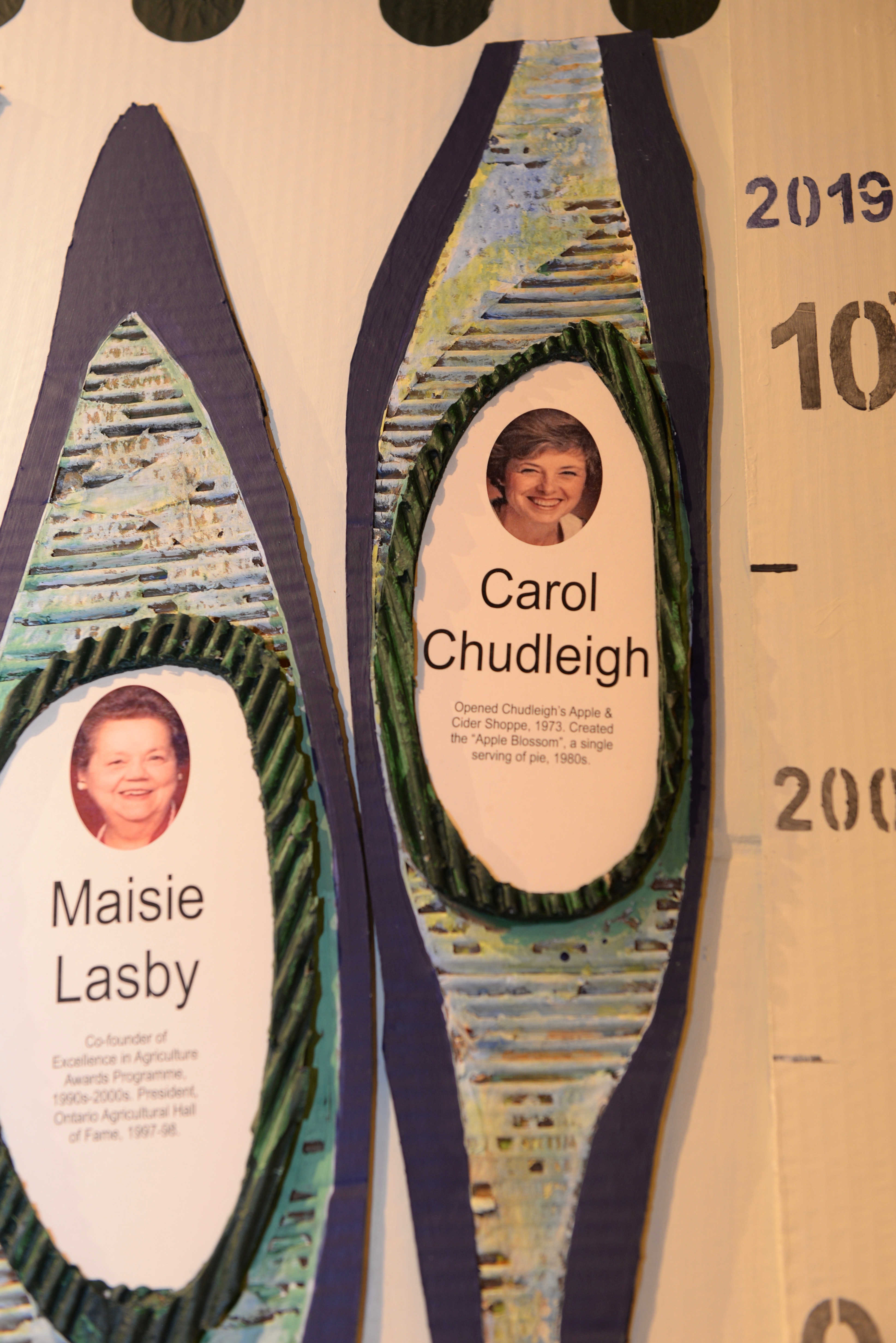In a Press Release, Barbara Shein and Susan Snooks, Co-Chairs of CFUW Milton & District’s 100th Anniversary Committee told how ‘together (with FASM) we are creating a sculpture installation marking the accomplishments of 100 women in our community over the past 100 years. There (are) five 8’ x 2’ x 2’ pillars representing The Arts, Community, Rural, Education and the Professions. Using layered cardboard, the Artists (have designed) a unique look for each woman that…include her image and a brief description of her most notable contribution.’