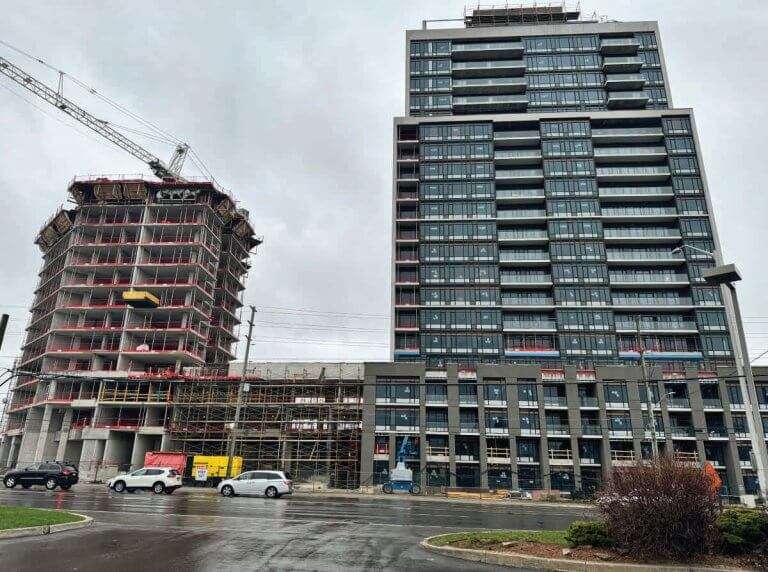 At Milton Town Council on April 15th council reviewed a zoning by-law amendment by the developer of the three story condo complex at the South East corner of Derry & Ontario Street. The developer was requesting both a re-introduction of a three-storey 27-unit stacked townhouse complex beside the 14, 20 and 25 storey buildings currently being constructed as well as a reduction on the number of visitor parking spaces for for the overall development.