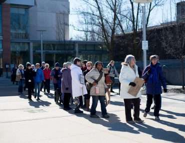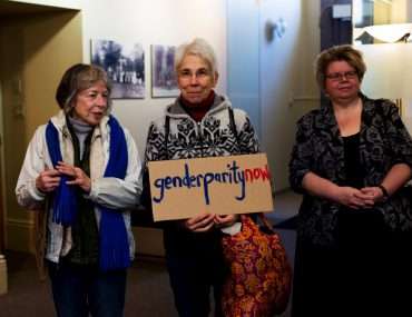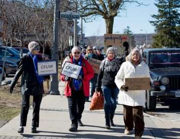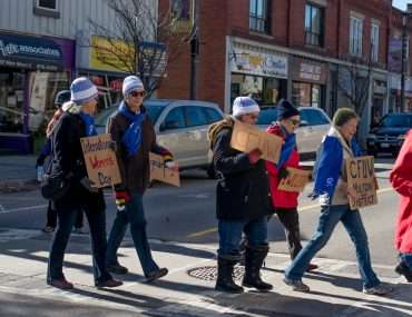 The Mayor began by saying: “One of the things I was born with was a reasonably good voice. Milton doesn’t have a town crier so I stand in for one occasionally: “I do so here proclaim Wednesday March 8th 2017 CFUW Milton and District Day in the Town of Milton!” After several photos were taken of the group, armed with banners, the women marched through downtown Milton to raise awareness about this years’ theme: Gender Parity.